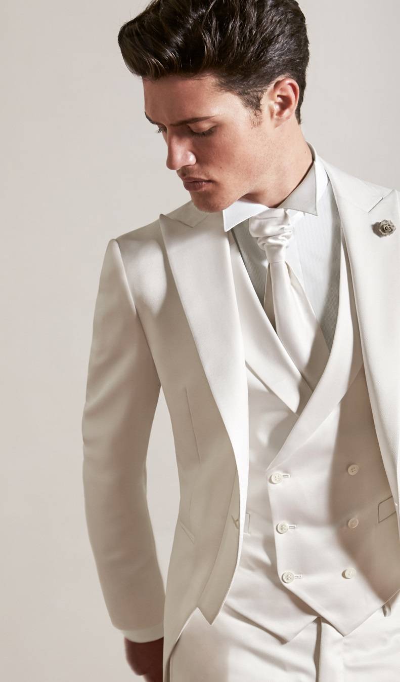 Costume ivoire trois pièces complet de marié Lubiam 1911 cérémonia sur MARSEILLE. Poposé en tissu nid d'abeilles micro dessin, coloris blanc naturel ou ivoire très clair. La célèbre veste de costume décrochée, travail du bas de veste qui laisse entrevoir le gilet du marié.