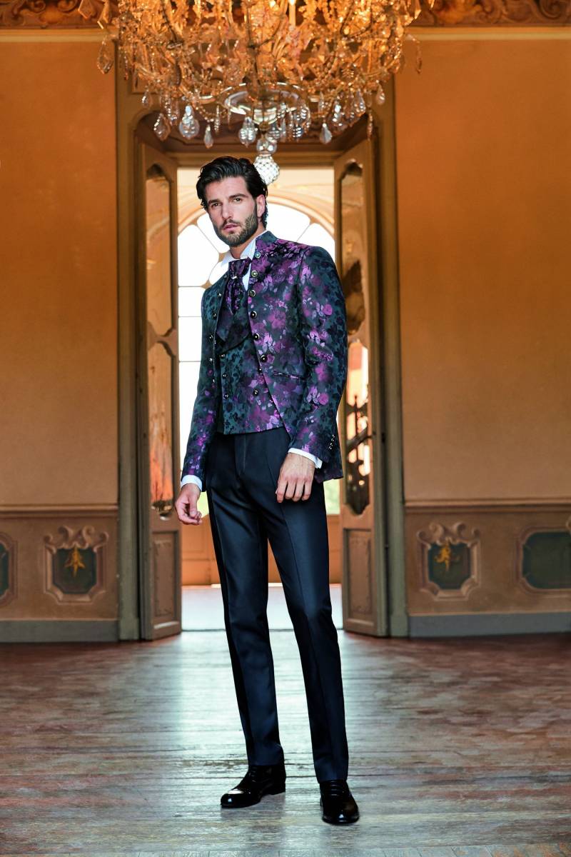 Cette veste de mariage LUIGI BIANCHI 1911 à motif de fleurs vieux rose et lie de vin sur fond noir, se distingue par le coloris rose et vieux rose, assemblés à du lie de vin ou bordeaux plus foncé, cette veste de cérémonie imprimée est coordonnée à son gilet simple ou veston croisé, le tout monté sur un pantalon ajusté et slim taille basse de coloris prune.
