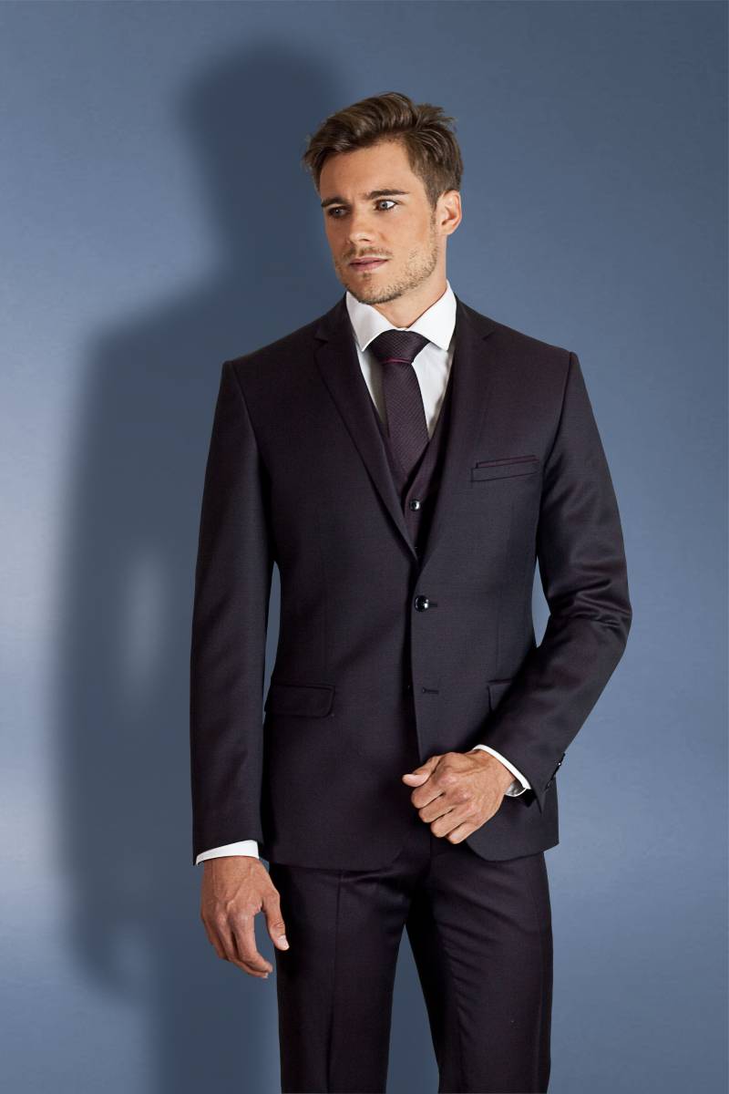Choisir son costume de cérémonie sur Marseille, smoking cintré satiné assorti d'une cravatone, d'un pantalon taille basse slim fit et d'un gilet boutonné.