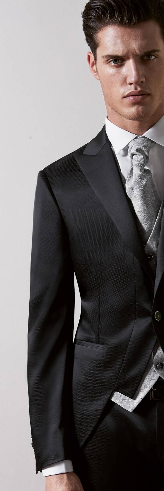 Costume gris foncé micro dessin chevrons avec un beau gilet vintage à col, orné de beaux boutons bijoux Lubiam, ton sur ton assortis à la veste, cravalière et gilet croisé micro dessin dans un gris plus clair dégradé.