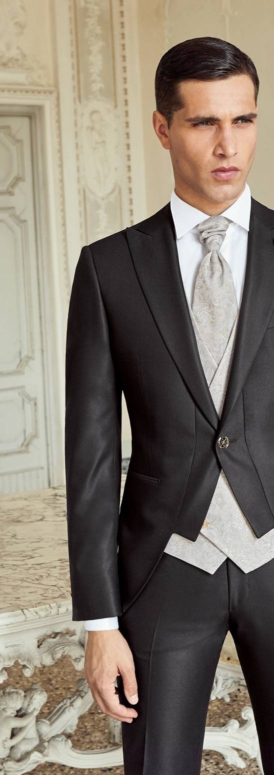 La veste de costume de marié Lubiam 1911, présentée est moderne et originale de par sa forme qui est peu commune. Elle laisse entrevoir le gilet sur le bas de la veste et ses boutons bijoux. Le gilet ou veston de marié fait partie intégrante du costume du marié. Le pantalon est slim fit étroit sur le bas de jambe dans la tendance actuelle.