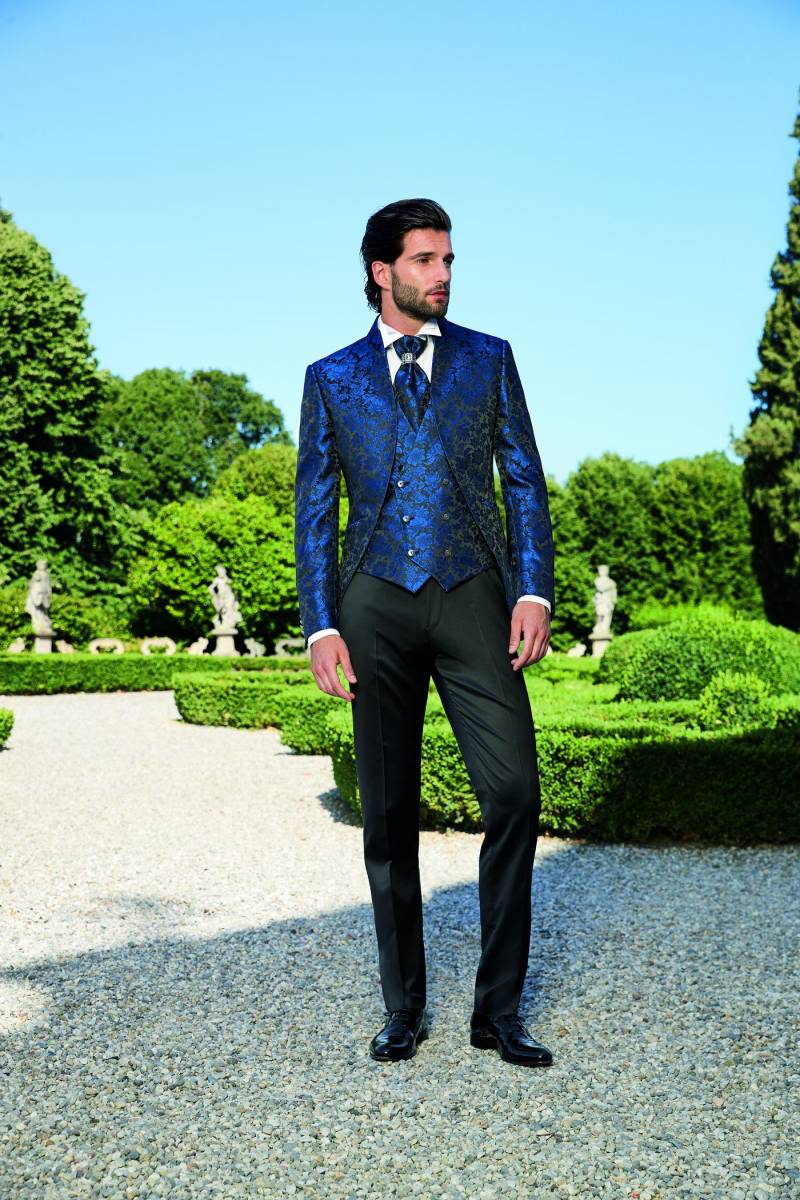 Notre boutique Espace Homme Cérémonie vous propose une veste en brocard bleu sur fond noir avec un col mao . Cette veste de marié décolleté sur le devant pour permet de mettre en valeur le gilet croisé dans le même tissu que le Brocard bleu et noir.